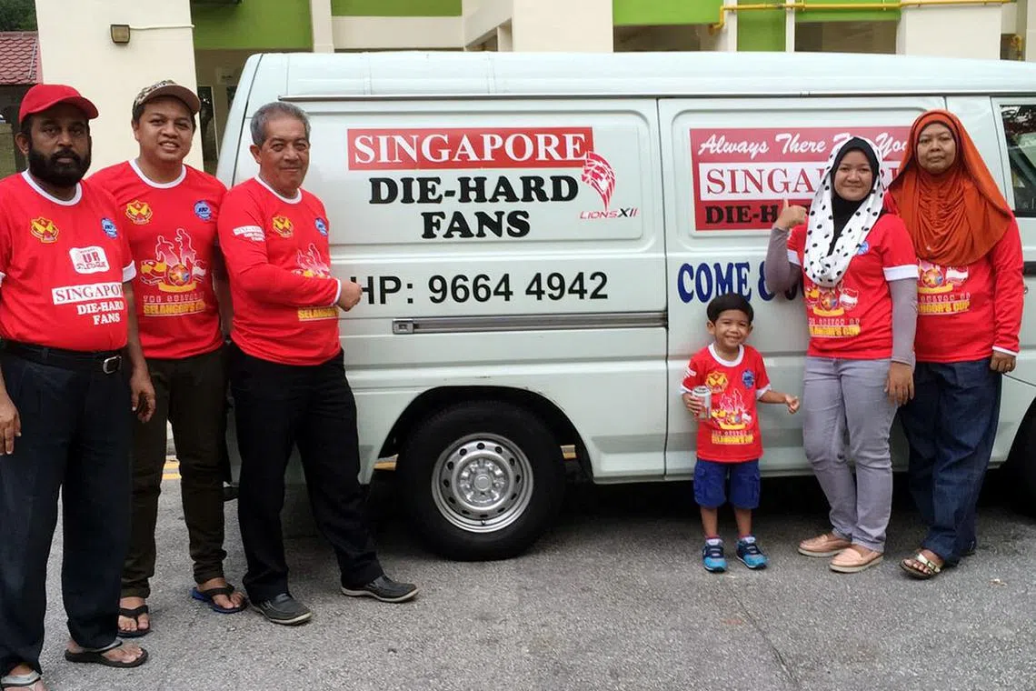 SOKONGAN SETIA: Akbar Hashim (kiri) dan kumpulan Die Hard Fans Singapore menyediakan kemeja-T khas bagi Piala Sultan Selangor. - Foto ihsan AKBAR HASHIM -