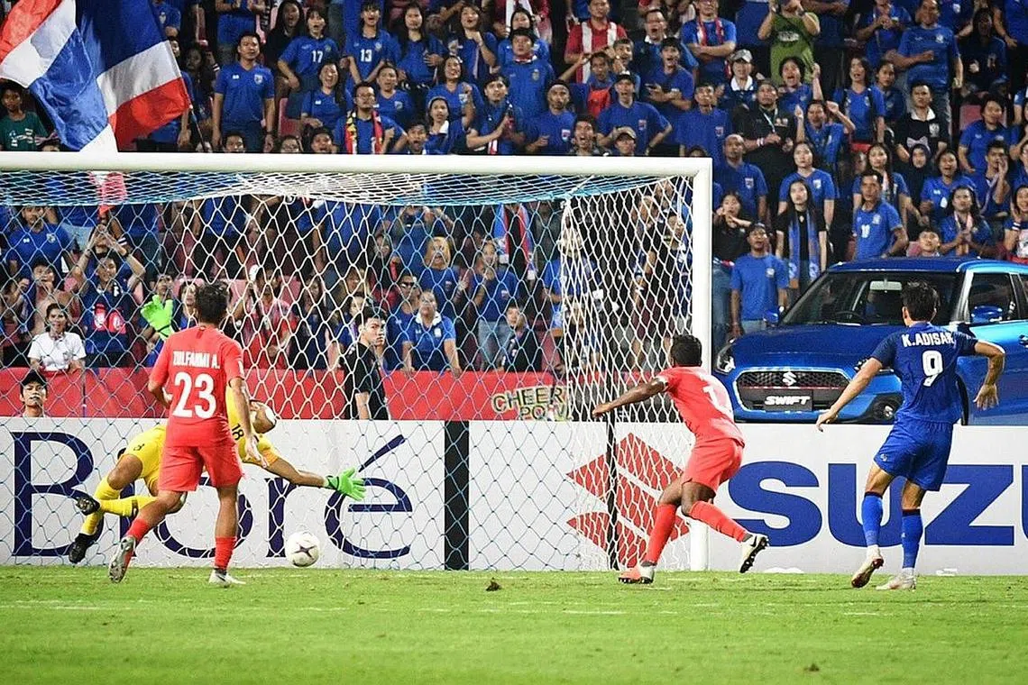 AKHIR TAHUN: Pemain Thailand, Adisak Kraisorn (biru) menjaringkan gol dalam Piala Suzuki AFF di Stadium Rajamangala pada 25 November 2018. - Foto fail -