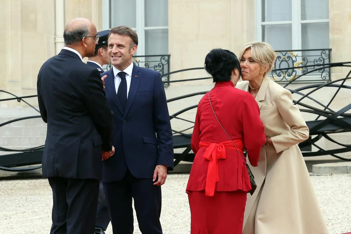 Presiden Tharman Shanmugaratnam dan isterinya, Puan Jane Ittogi, disambut oleh Presiden Perancis, Encik Emmanuel Macron, dan isterinya, Cik Brigitte Macron, apabila mereka menghadiri majlis jamuan praupacara pembukaan Sukan Olimpik di Paris pada 27 Julai.