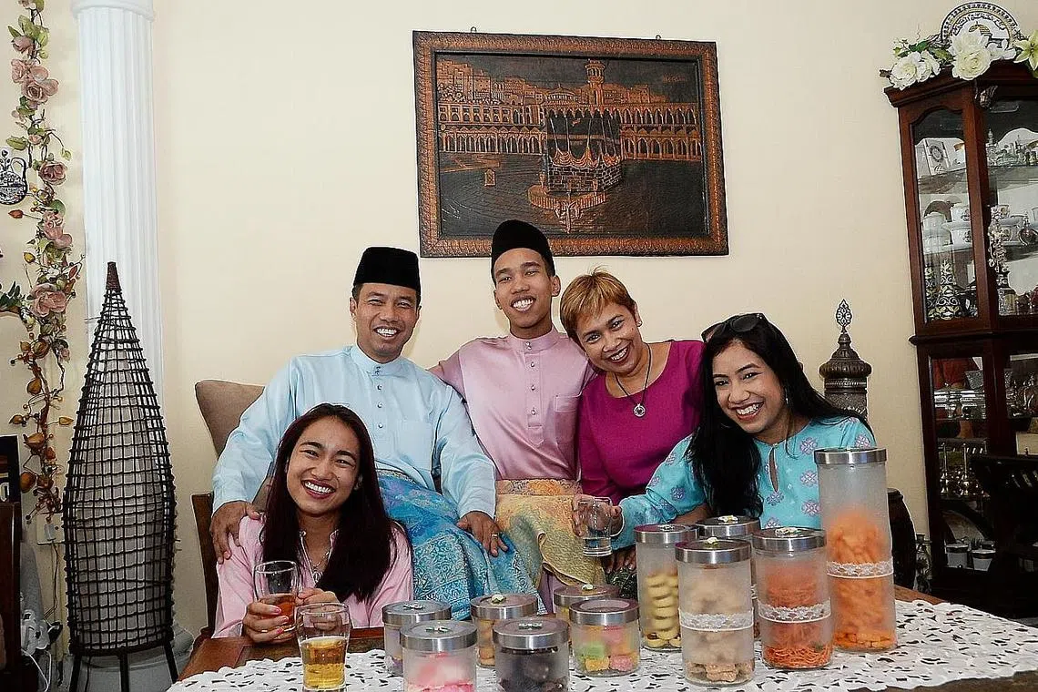CERIA RAYA BERSAMA: Hishammudin dan isteri, Suhailah, bersyukur anak-anak mereka - (dari kiri) Dhaniyah, Daim dan Dorrah - dapat bersama di pangkuan keluarga tersayang sempena Lebaran tahun ini. Pasangan ini berpangkalan di Kuala Lumpur tetapi berpeluang menghabiskan minggu pertama Raya di rumah ibu bapa Hishammudin di Bedok North. - Foto JOHARI RAHMAT -