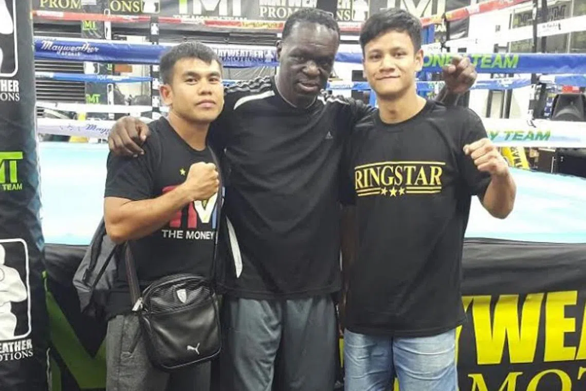 PELUANG KEEMASAN: Ridhwan (kanan) bergambar dengan Jeff Mayweather (tengah), bekas juara dunia yang juga pak cik kepada juara tinju yang tidak pernah kalah, Floyd Mayweather. Di kiri ialah jurulatih peribadi Ridhwan, Rey Caitom. - Foto RINGSTAR MANAGEMENT -