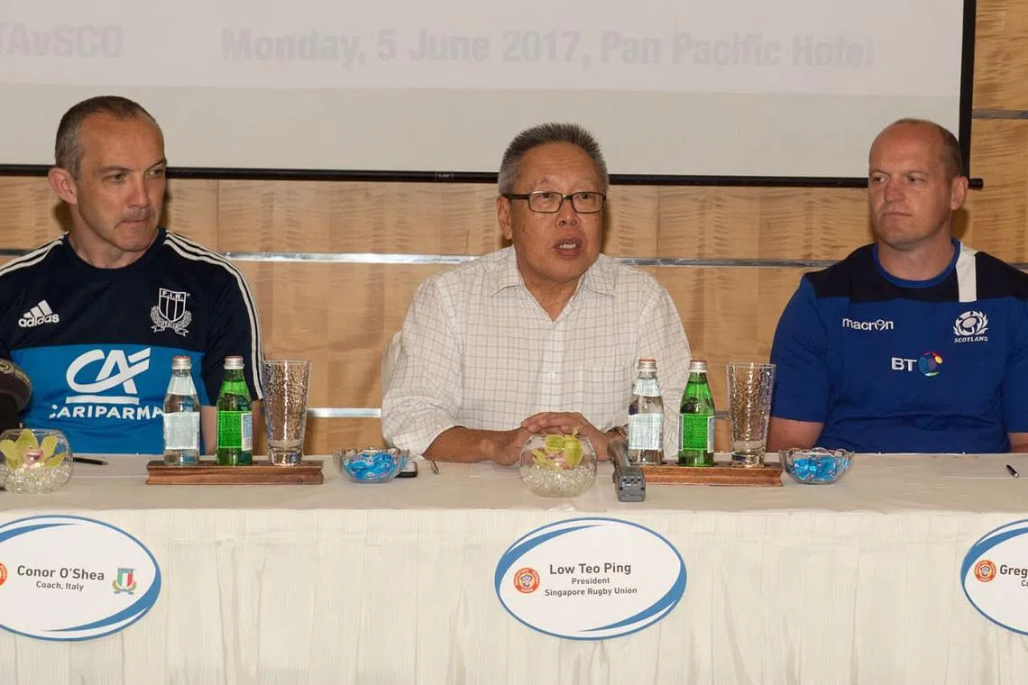 PERLAWANAN RAGBI: Presiden Kesatuan Ragbi Singapura Low Teo Ping (tengah) bersama jurulatih pasukan ragbi Italy Conor O'Shea (kiri) dan jurulatih pasukan ragbi Scotland Gregor Townsend menghadiri sidang media di Hotel Pan Pacific semalam tentang perlawanan ujian Italy-Scotland yang bakal diadakan Sabtu ini. - Foto RUGBY SINGAPORE -