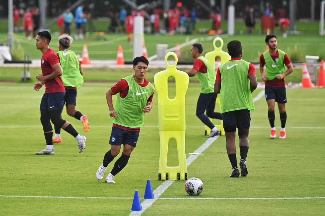 Pemain tengah Lion City Sailors, Song Ui-yong (tiga dari kiri), gigih menjalani latihan pusat pasukan negara di Hab Bola Sepak Kallang pada 27 Mei 2024. - Foto BH oleh KHALID BABA
