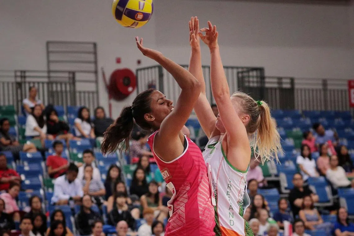PERLU KONSISTEN: Pemain Singapura Sindhu Nair (atas) bergelut dengan pemain Ireland (kiri) untuk mendapatkan bola dalam kemenangan 51-35 di Arena OCBC kelmarin. - Foto BH oleh JASON QUAH -