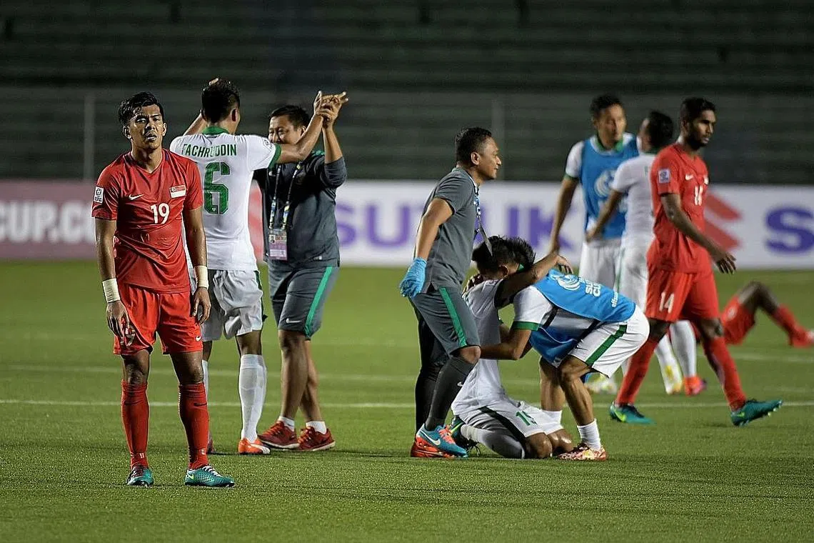 WAJAH HAMPA: Dua tunggak Singa, kapten Hariss Harun (kanan) dan Khairul Amri (jersi 19), kecewa di akhir perlawanan sedang para pemain Indonesia (berjersi putih) meraikan kejayaan melayakkan diri ke separuh akhir. - Foto THE STRAITS TIMES -