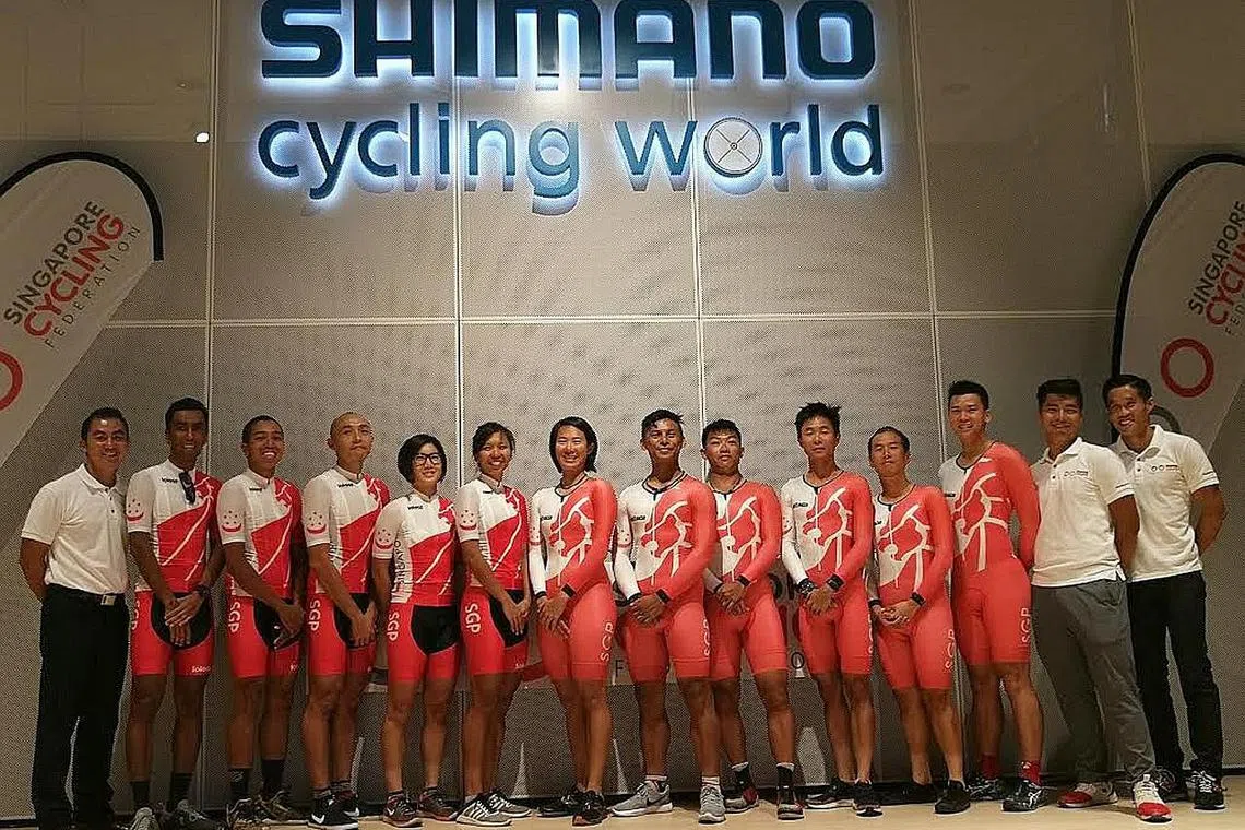BERSEDIA SAHUT CABARAN: Skuad lumba basikal negara bersama pegawai SCF, pengurus pasukan, Desmond Low (kiri), serta jurulatih pasukan (dari kanan) Adrian Ng dan Ang Kee Meng. - Foto FAKHRURADZI ISMAIL -