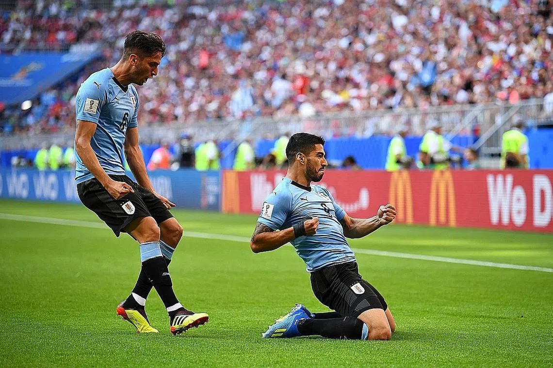 RAIKAN GOL: Pemain Uruguay Luis Suarez (kanan) dan Rodrigo Bentancur meraikan gol yang dijaringkan Suarez pada minit ke-10 dalam perlawanan menentang Russia. Uruguay akhirnya menewaskan Russia 3-0 namun kededua pasukan berjaya mara ke peringkat seterusnya. - Foto REUTERS -