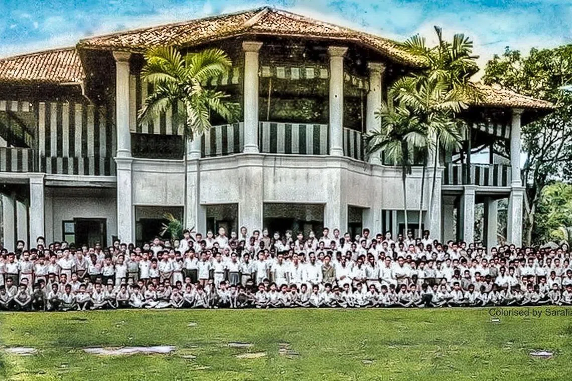 ISTANA WOODNEUK: Di zaman kegemilangannya dan ketika dikunjungi Encik Sarafian (gambar atas, kanan) bersama kumpulan Temasek Rural Exploring Enthusiast dan pelajar-pelajar yang menyertai lawatan menjejak warisan yang dianjurkannya tidak lama dulu. -