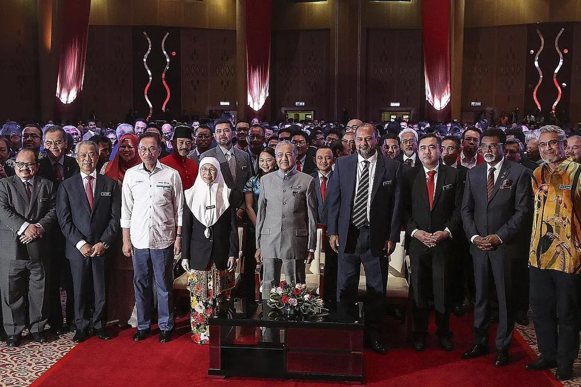 MERAIKAN ULANGTAHUN PERTAMA PEMERINTAHAN PAKATAN HARAPAN: Perdana Menteri Malaysia, Tun Dr Mahathir Mohamad (tengah) bersama-sama timbalan perdana menteri Dr Wan Azizah Wan Ismail (empat dari kiri) dan suami, Datuk Seri Anwar Ibrahim (tiga dari kiri), bergambar dengan pemimpin lainnya selepas menyampaikan amanat khas sempena ulangtahun pertama pentadbiran Pakatan Harapan di Putrajaya, pada 9 Mei lalu. - Foto EPA-EFE -