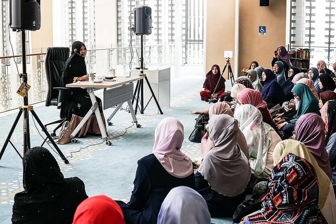 CUNGKIL ILMU DARIPADA LIPATAN SEJARAH: Ustazah Dr Sakinah Saptu menyampaikan kisah lima wanita waja dalam majlis 'Muslimah Hour' di Masjid Darul Ghufran, Tampines, baru-baru ini. - Foto BH oleh NUR DIYANA TAHA -