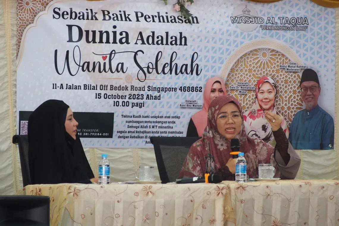 PERJELAS SUMBANGAN WANITA KEPADA MASYARAKAT: (Dari kiri) Panelis, Ustazah Asni Abu Mansor dan Ustazah Dr Norhafizah Musa, dalam forum perdana, ‘Sebaik-baik Perhiasan Dunia Adalah Wanita Solehah’ yang berlangsung di Masjid Al-Taqua pada 15 Oktober. - Foto MASJID AL-TAQUA