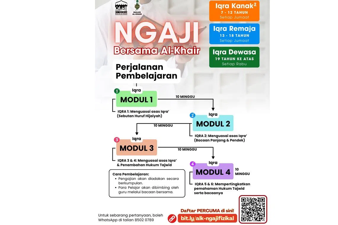 Masjid Al-Khair menjemput semua jemaah, daripada kalangan yang baru mengenal huruf hingga yang ingin memperbaiki bacaan, untuk menyertai program Ngaji Fizikal! - Foto MASJID AL-KHAIR
