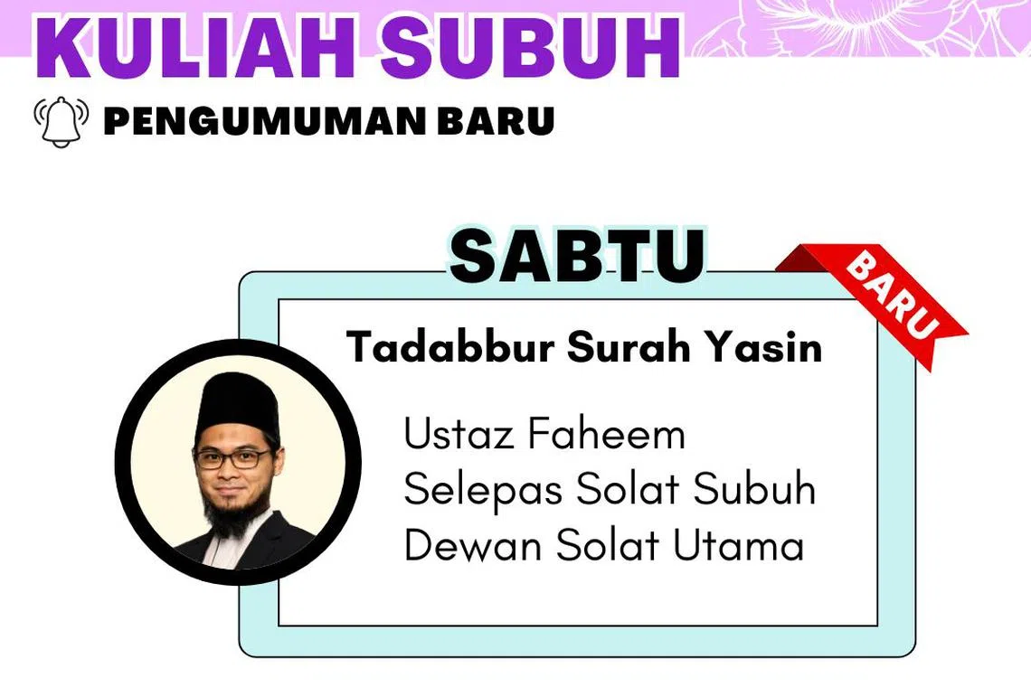 Mari sertai kuliah subuh setiap Sabtu bersama, Ustaz Muhd Faheem Abdul Khalil, untuk mendalami keindahan dan hikmah di sebalik ayat-ayat Surah Yasin.