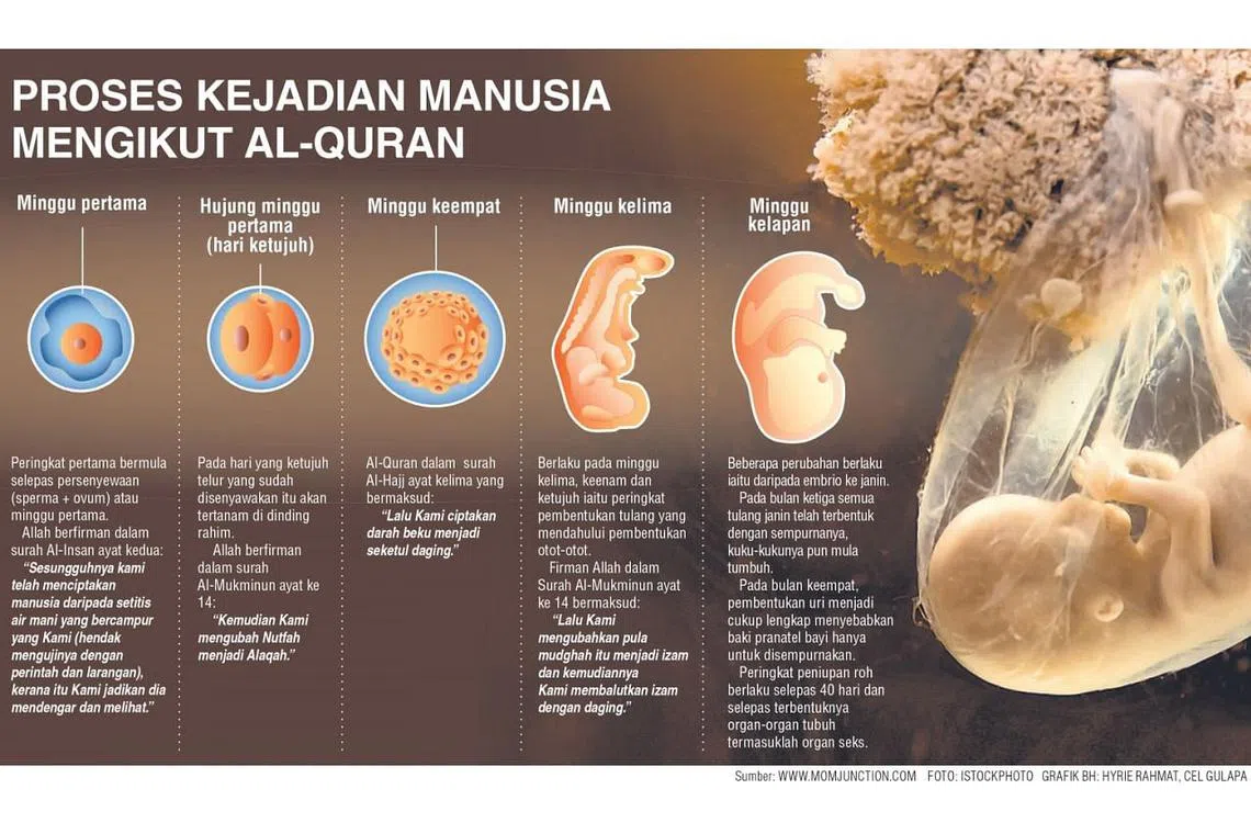 "Lalu Kami ciptakan darah beku itu menjadi seketul daging; kemudian Kami ciptakan daging itu menjadi beberapa tulang; kemudian Kami balut tulang-tulang itu dengan daging. Setelah sempurna kejadian itu Kami bentuk dia menjadi makhluk yang lain sifat keadaannya. Maka nyatalah kelebihan dan ketinggian Allah sebaik-baik Pencipta."