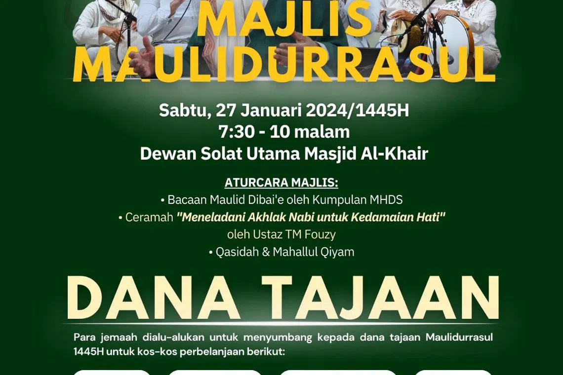 Masjid Al-Khair dengan kerjasama Persatuan pembangunan Akhlak dan Insan (MHDS) akan mengadakan Majlis Maulidur Rasul pada 27 Januari di dewan solat utama masjid.