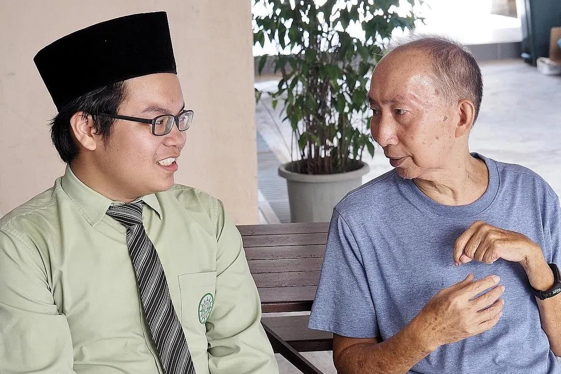 DEKATI MASYARAKAT: Encik Wong Chin Jiang (kanan), seorang guru pesara, amat terkesan dengan akhlak baik yang dipamerkan para pelajar MAI. Di kiri ialah pelajar MAI, Hasan Abdul Razak. Foto MADRASAH AL-ARABIAH AL-ISLAMIAH -