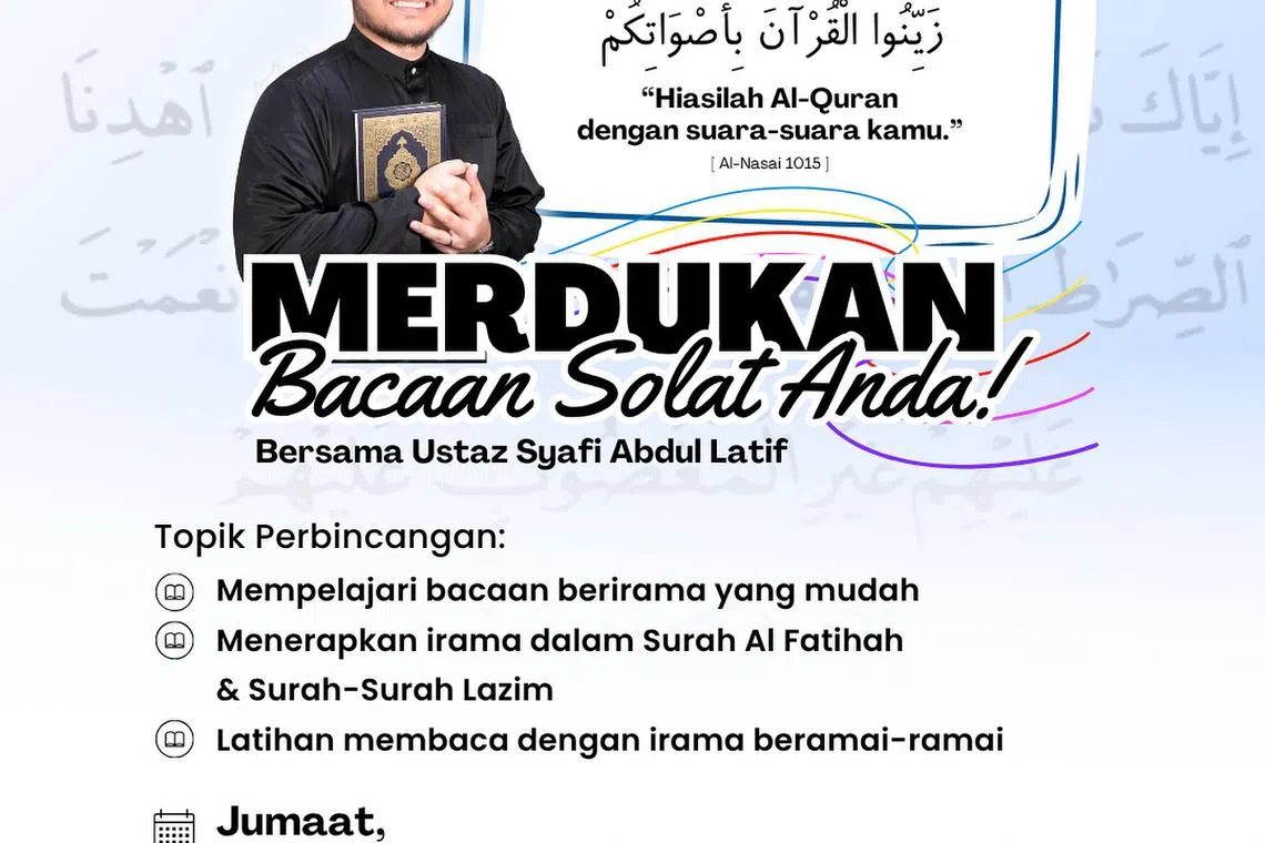 Program, ‘Merdukan Bacaan Solat Anda’. dapat membantu dalam memperbaiki dan memperindah bacaan dalam solat kerana sesungguhnya bacaan yang betul membawa kepada solat yang lebih diterima di sisi Allah swt.