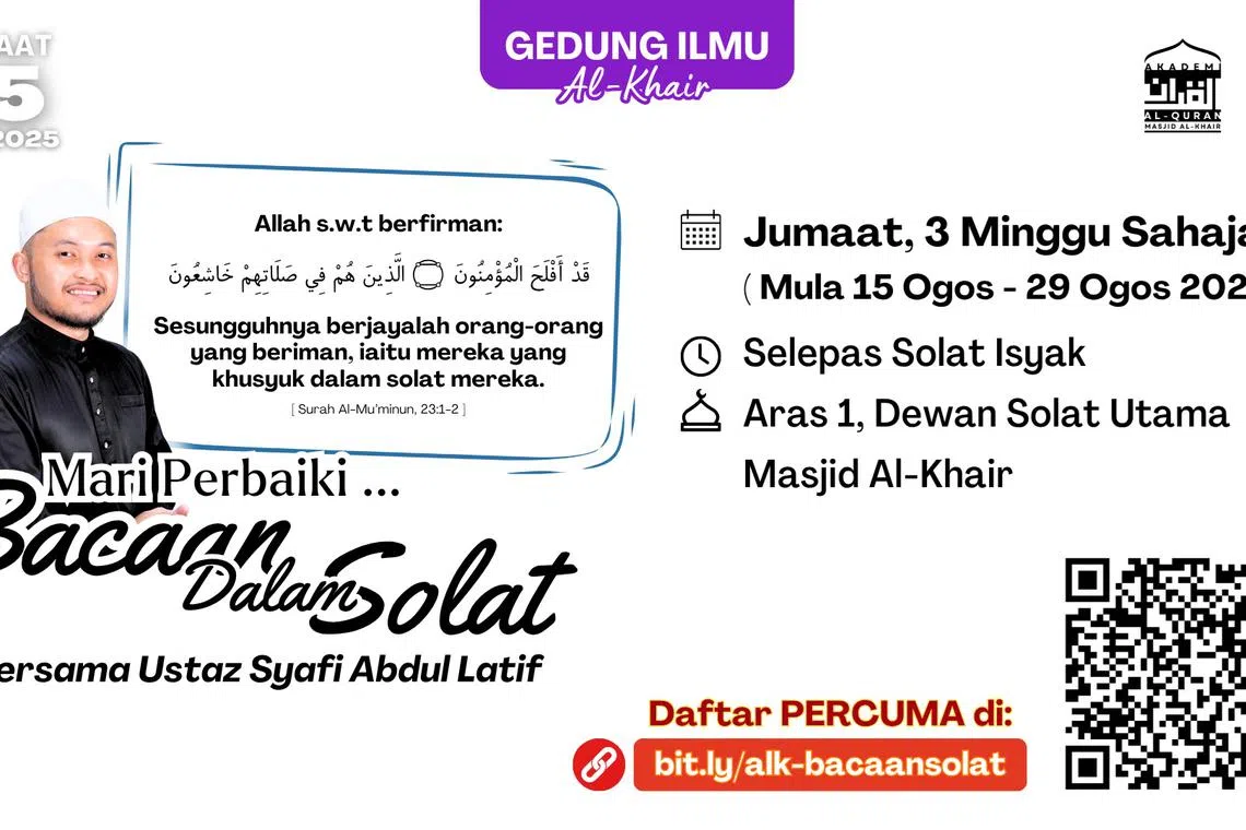 Ayuh sertai kelas, Mari Perbaiki Bacaan Dalam Solat, bersama Ustaz Syafi Abdul Latif.