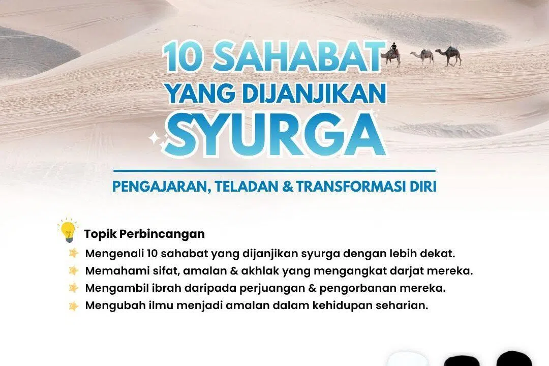 Melalui siri ‘10 Sahabat yang Dijanjikan Syurga’, peserta akan dibimbing menyelami kisah para sahabat, mengenali sifat dan amalan mereka, serta mengambil pengajaran bagaimana teladan tersebut boleh dihidupkan dalam kehidupan harian.