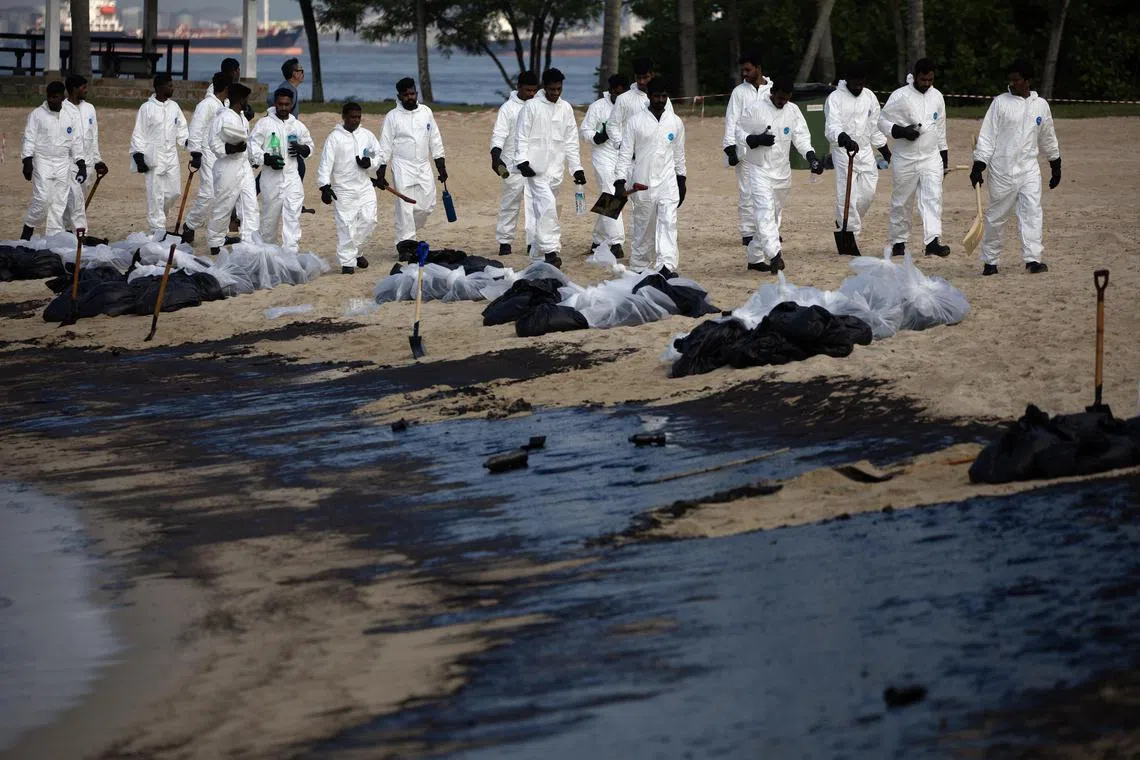Pekerja tiba untuk membersihkan tompokan minyak di Pantai Tanjong di Sentosa menyusuli tumpahan minyak yang berlaku selepas kapal Vox Maxima melanggar kapal pembekal minyak Marine Honor di Terminal Pasir Panjang. - Foto EPA-EFE