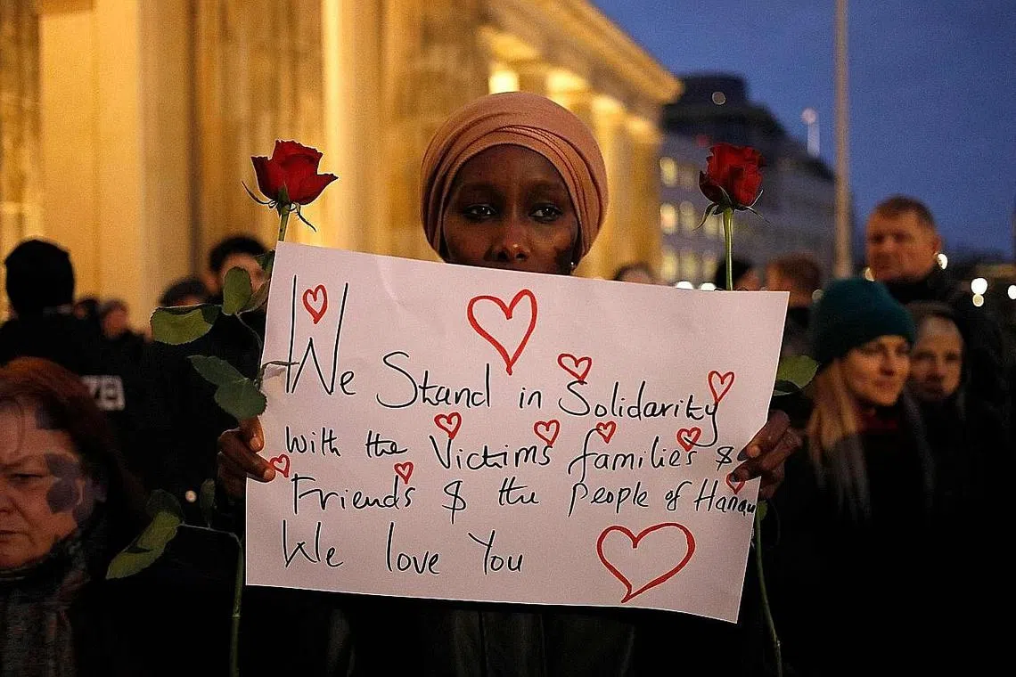 PAPAR PERPADUAN: Wanita ini menyertai acara memperingati mangsa korban insiden tembakan yang membunuh sembilan orang di Hanau, Jerman, dalam gambar fail yang diambil Februari lalu. - Foto AFP -