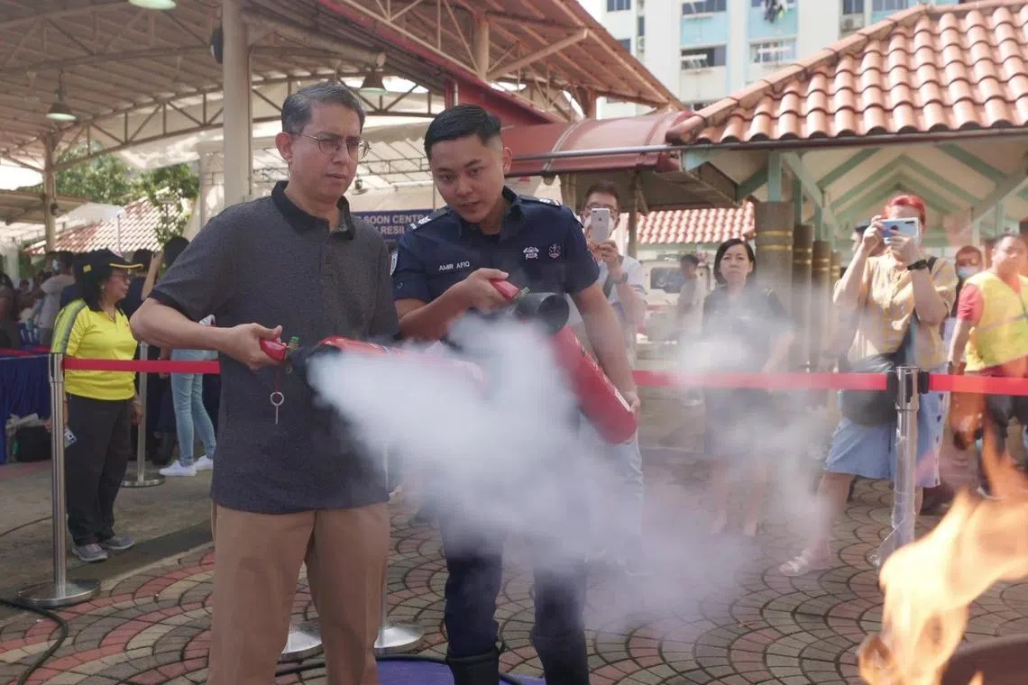 Profesor Madya Dr Muhammad Faishal Ibrahim (kiri) di acara Akar Umbi Masyarakat di Nee Soon Central di mana penduduk diajar cara menggunakan alat pemadam api. - Foto MHA