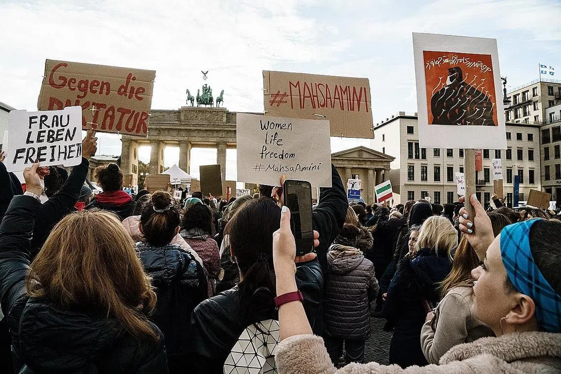 BANTAHAN MEREBAK: Penunjuk perasaan memegang plakad semasa perhimpunan membantah kematian Cik Mahsa Amini, di hadapan Gerbang Brandenburg di Berlin, Jerman, 28 September 2022. Cik Mahsa seorang wanita Iran berusia 22 tahun, telah ditangkap polis pencegah maksiat di Tehran pada 13 September oleh polis. Beliau koma semasa dalam tahanan polis dan diisytiharkan mati pada 16 September. - Foto EPA-EFE -