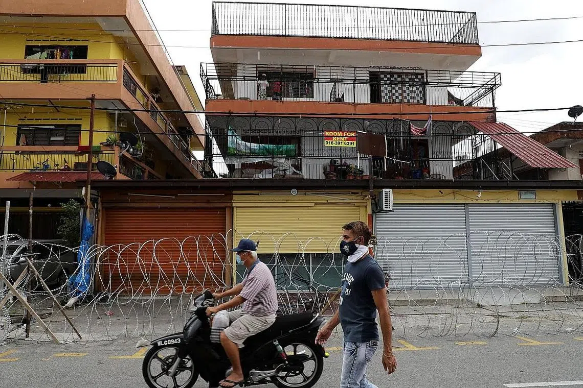 SEMUA DITUTUP: Penduduk setempat memakai pelitup di Selayang, Selangor, sedang Kawalan Pergerakan Diperketatkan (KPKD) dikuasa kuasa dimulai 25 April hingga 3 Mei bagi terus mengekang penularan jangkitan Covid-19 di situ. - Foto REUTERS -