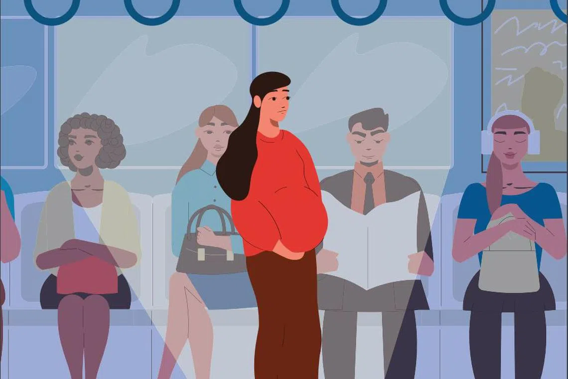 TERPAKSA BERDIRI: Meskipun mungkin sukar dipercayai, ramai wanita hamil berkongsi pengalaman tidak diberi tempat duduk oleh penumpang lain ketika dalam kereta api atau pengangkutan awam. - GRAFIK oleh IFFAH QISTINA