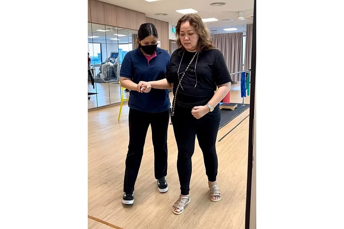 SEMANGAT KENTAL: Pelatih Perubatan Cik Rabiatul yang sedang membantu Cik Suzie (kanan) untuk berjalan, yang sebelum ini lumpuh separuh badan. Beliau kini mampu berdiri dan berjalan meskipun perlahan. - Foto BH oleh HANS ASHRIE -
