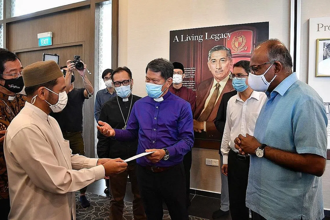 ERATKAN PERPADUAN: Encik Shanmugam (kanan) bersama pemimpin Kristian termasuk Presiden NCCS, Reverend Keith Lai (berbaju ungu), telah menemui Mufti Dr Nazirudin Mohd Nasir (kiri) dan Ketua Eksekutif Muis, Encik Esa Masood (bersongkok hitam), di Masjid Yusof Ishak pada Khamis lalu. Dr Faishal (dua dari kanan) turut hadir. - Foto BM oleh CHONG JUN LIANG -