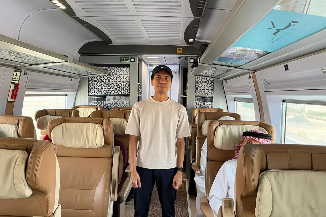 DALAM PERJALANAN: Wartawan BM, Izwandi Azman, menaiki kereta api berkelajuan tinggi (HSR) untuk membuat perjalanan ke Madinah. - Foto BM