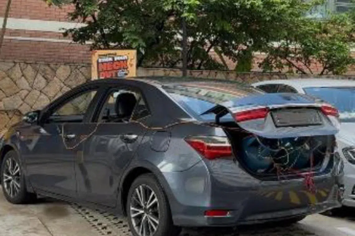 Dalam uji kaji berbeza pula, tong gas yang agak jelas kelihatan dibiarkan di but kereta yang separuh terbuka dengan kepulan asap turut keluar secara berkala.