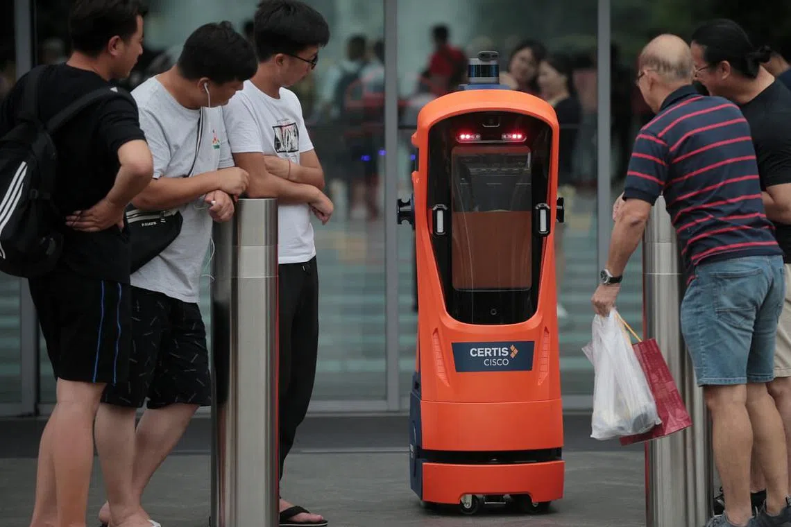 ERA TEKNOLOGI DAN AUTOMASI: Pengunjung di Jewel Lapangan Terbang Changi melihat secara dekat robot autonomi kendalian Certis Cisco pada 4 Jun lalu. Menurut penulis, rakyat Singapura perlu belajar untuk bekerja bersama robot untuk melangkah lebih jauh ke hadapan. - Foto BH oleh JASON QUAH -